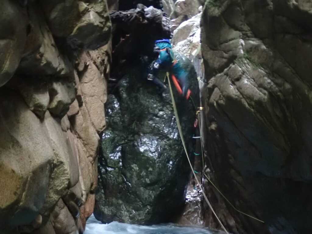 巻き終った地点で谷は右に折れさらに深くて暗いゴルジュを形成していたが、これが最難関の核心「CS(チョックストン)のゴルジュ」だった。