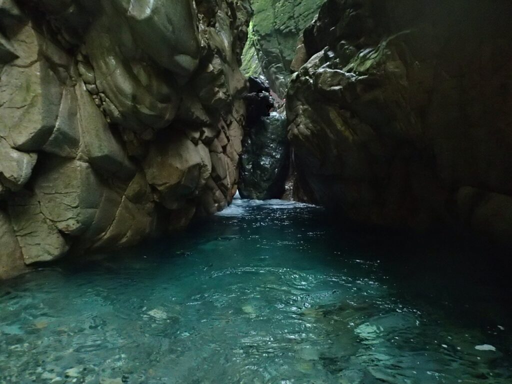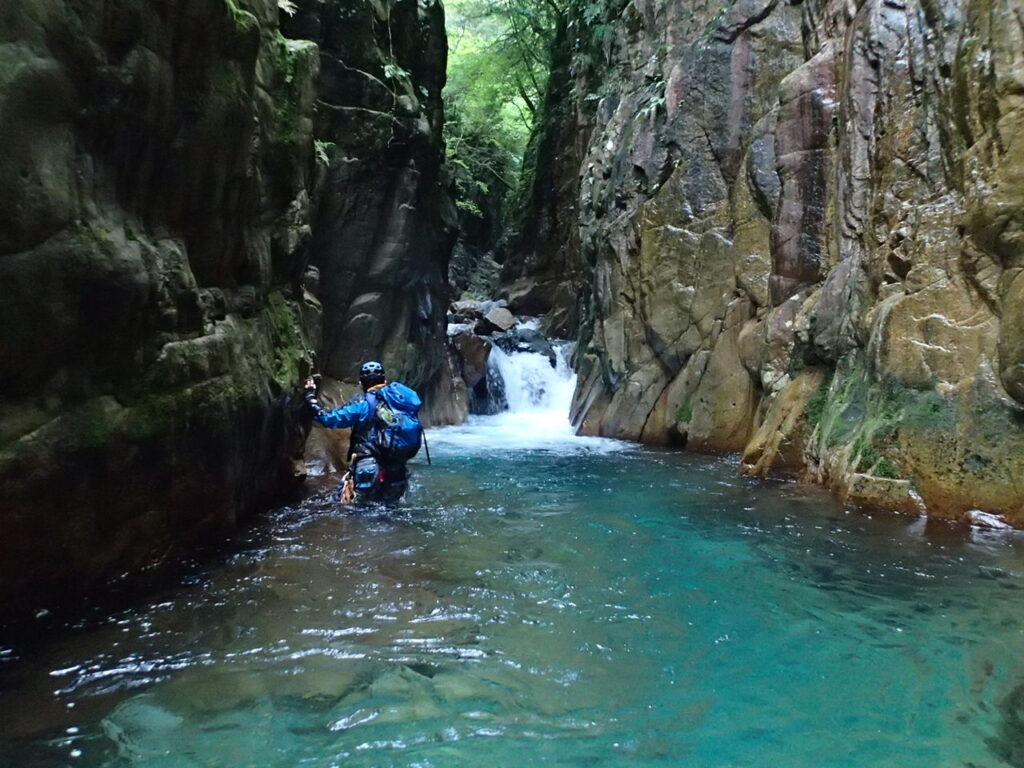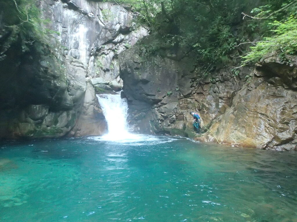 井戸底のようなゴルジュに海の名の通り青い水が流れる不思議な景観の中を往くと、渓が明るく開けて第2の核心「大釜の5m」。リーダー氏は昨年、セカンドの引上げに失敗してここで敗退したとのこと。