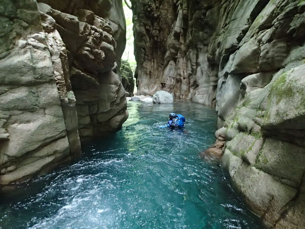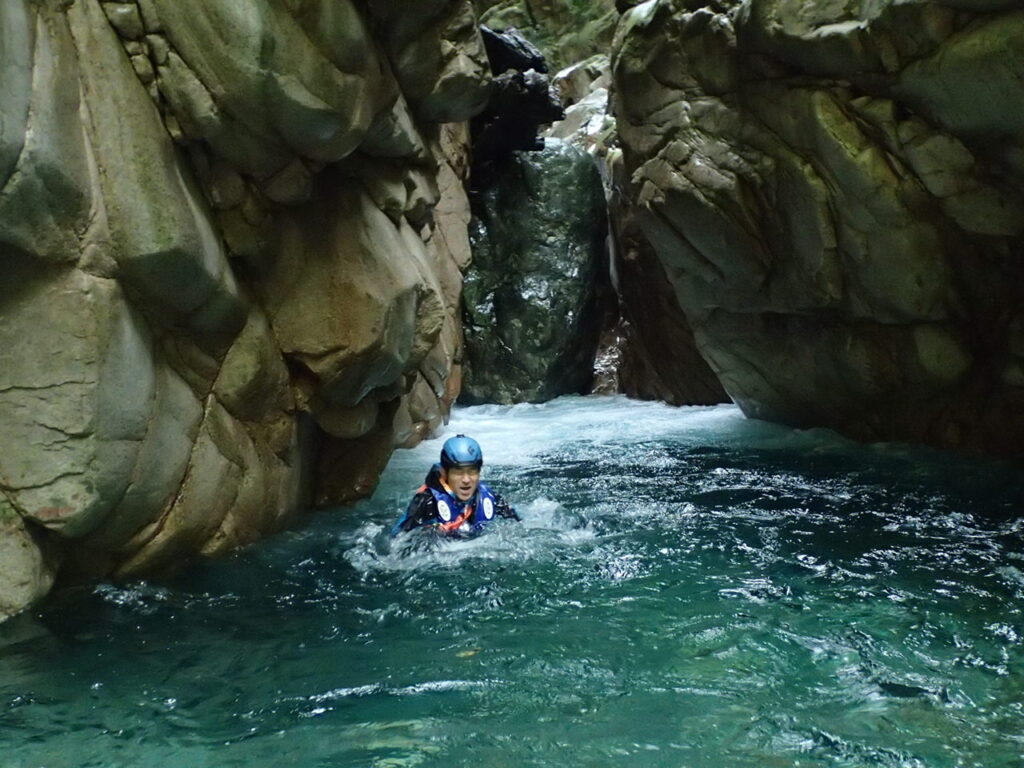 海ノ溝洞林道を歩いて核心部の上流で川床に降り立ち、海の水のように青い流れを下降する。淵の泳ぎもらくちん、プカプカ流れに任せるだけ。