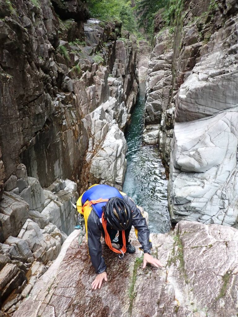 見た目以上に流れは重く強い。側壁のわずかなホールドを拾いながらじりじりと前進するが、ちょっと気を抜くとよよよと押し戻されてしまう。中間地点のテラスを中継に何とか出口手前の左岸テラスに辿り着いた。この先は一旦、右岸に渡り返して行けるとこまでヘツって激流を左岸終了点に泳ぎ渡るのだが着岸に失敗すれば元のとこまで流される… それはごめんこうむりたい。幸い2人とも激流の渡河に成功しガリーを這い上がってゴルジュ出口の岩の上に出た。
