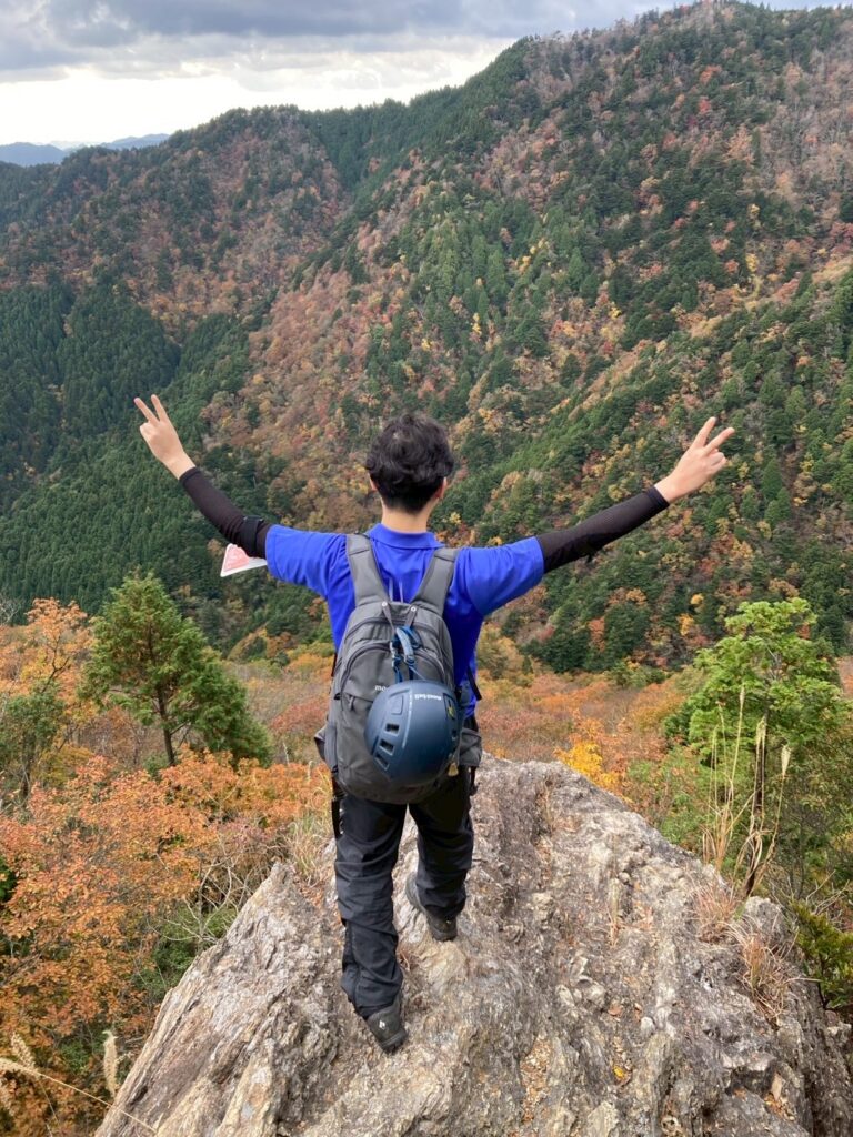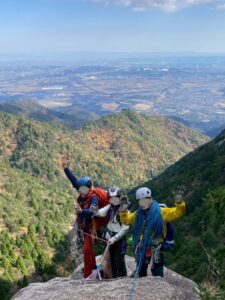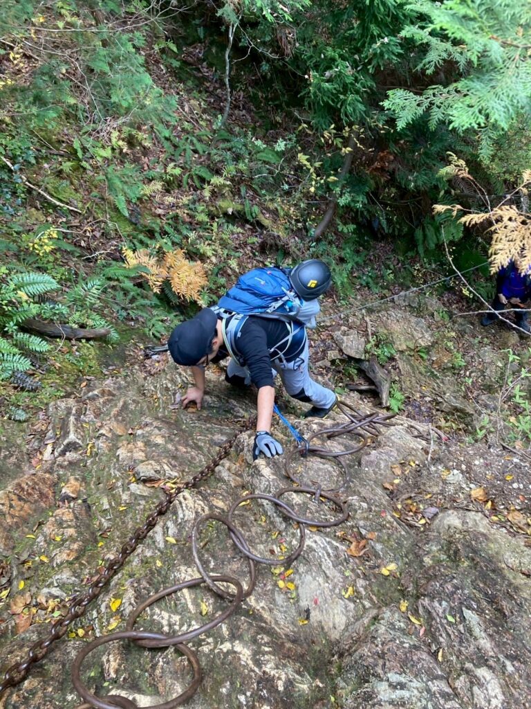 紅葉真っ盛りの雪彦山で簡易ハーネスを使って自己確保しながら鎖場を通過する訓練を行いました。