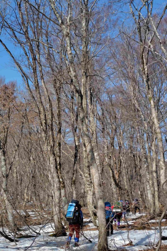 徳山ダムから能郷白山に至る長い尾根。リーダーが5年間温めて来たという計画を総勢8名で実行となった。湖底に沈んだ徳山集落から能郷白山への参拝の道だったというゴンニョの道として、数少ないが記録はある。果たしてどこまで行けることやら。まずは湖畔の駐車場に車を置いて出発。梯子を登りいきなりの急登だ。電波塔を越え少し落ち着くと3等村平。ここからの露岩帯は重荷には厳しい。コースは大体なだらかな尾根とやせ尾根、急な登り返しを繰り返すようなパターンで、ブナの樹林が楽しい。やがて雪上を歩くことが増え、1037mピークにテントを張った。ブナの大木があって頼もしい。