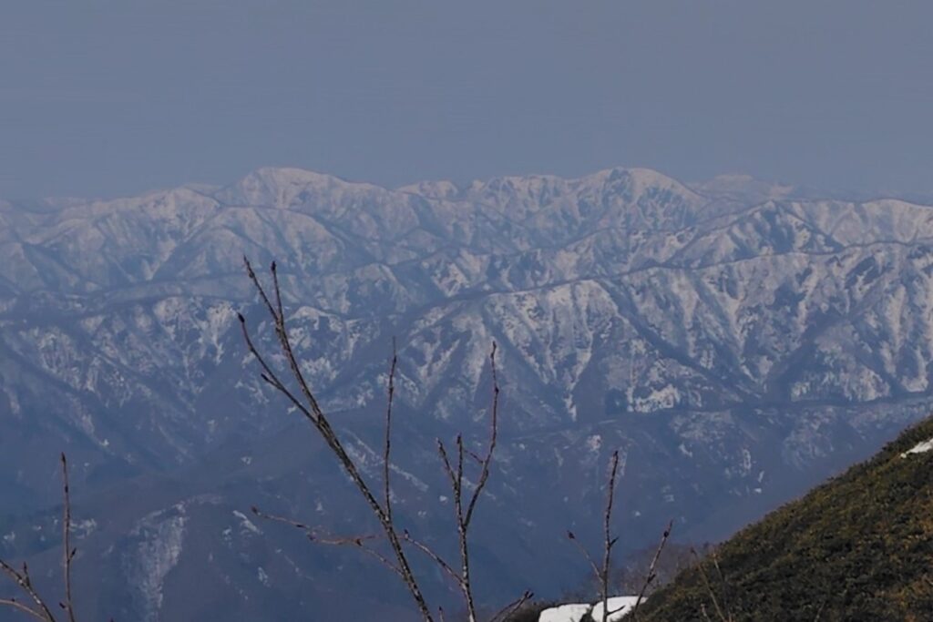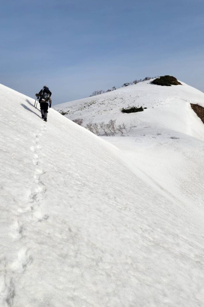 翌朝も急登から始まる。雪上に残るのは獣の足跡だけだ。鴨と呼ばれる一帯は窪地があるので雪が溶ければ池になるのか。三角点は雪の下か。何回かアップダウンを繰り返し、ついに磯倉から能郷白山に続くたおやかな稜線が眼前に広がった。しかし下りの時間を考えるとここまでか。。。名残惜しいが背を向けて長い道を下ることにした。