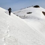 翌朝も急登から始まる。雪上に残るのは獣の足跡だけだ。鴨と呼ばれる一帯は窪地があるので雪が溶ければ池になるのか。三角点は雪の下か。何回かアップダウンを繰り返し、ついに磯倉から能郷白山に続くたおやかな稜線が眼前に広がった。しかし下りの時間を考えるとここまでか。。。名残惜しいが背を向けて長い道を下ることにした。